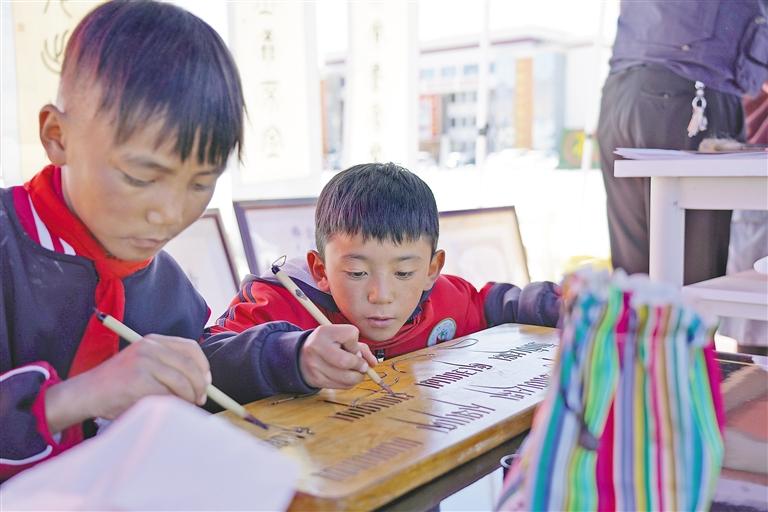在阿里地區(qū)“文化和自然遺產(chǎn)日”活動中,小朋友學(xué)習(xí)藏文書法。記者 達珍 洛桑旦增 攝