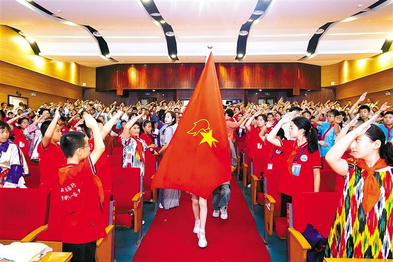 圖為夏令營主題隊(duì)會(huì)上,全體少先隊(duì)員向隊(duì)旗敬禮,齊唱《中國少年先鋒隊(duì)隊(duì)歌》。