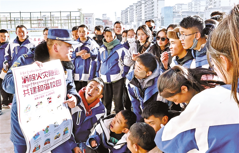 圖為那曲市消防救援支隊宣講員為師生講解消防安全知識。記者 王敏 通訊員 蔣貴忠 攝