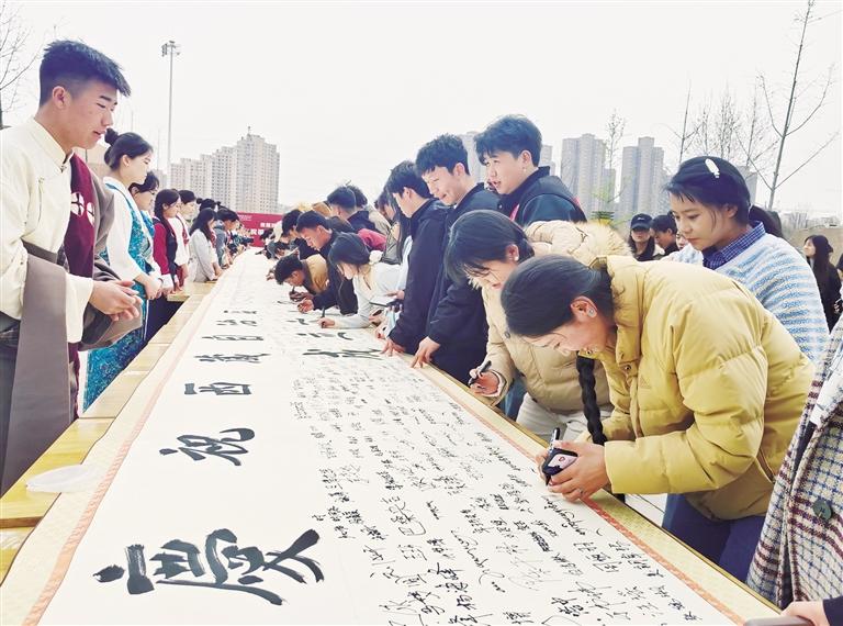 當(dāng)日清晨,一幅60米長(zhǎng)的潔白卷軸徐徐鋪展,上書(shū)“雪域高原一甲子滄桑巨變 渭水河畔六十春立德樹(shù)人”,歌頌了西藏自治區(qū)成立60年來(lái)的輝煌成就,也表達(dá)了學(xué)校60余載為黨育人、為國(guó)育才的初心。學(xué)校領(lǐng)導(dǎo)、離退休干部、教職工、學(xué)生代表齊聚渭城校區(qū),鄭重地在長(zhǎng)卷上簽下自己的姓名,每一筆都蘊(yùn)含著對(duì)黨的無(wú)限感恩、對(duì)祖國(guó)的無(wú)限熱愛(ài)和對(duì)西藏的無(wú)限祝福。