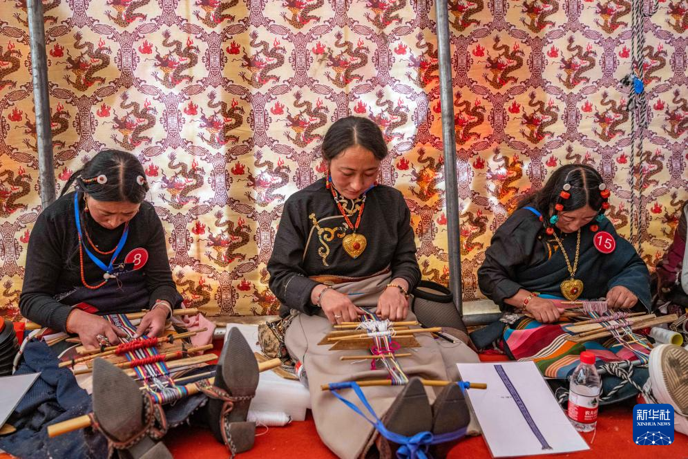 5月12日,在那曲市聶榮縣尼瑪鄉(xiāng),農(nóng)牧民選手們在帳篷里進行手工編織技能的比賽。新華社記者 孫非 攝 ??