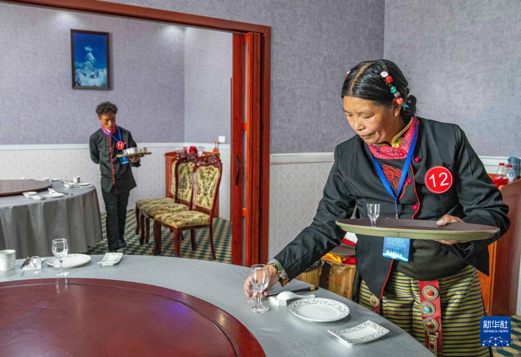 5月11日,在那曲市聶榮縣尼瑪鄉(xiāng),農(nóng)牧民選手們在進行酒店服務(wù)技能的比賽。新華社記者 陳尚才 攝 ??