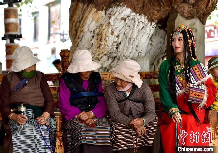 圖為9月7日游客在八廓街拍攝藏服寫真。中新社記者 李林 攝