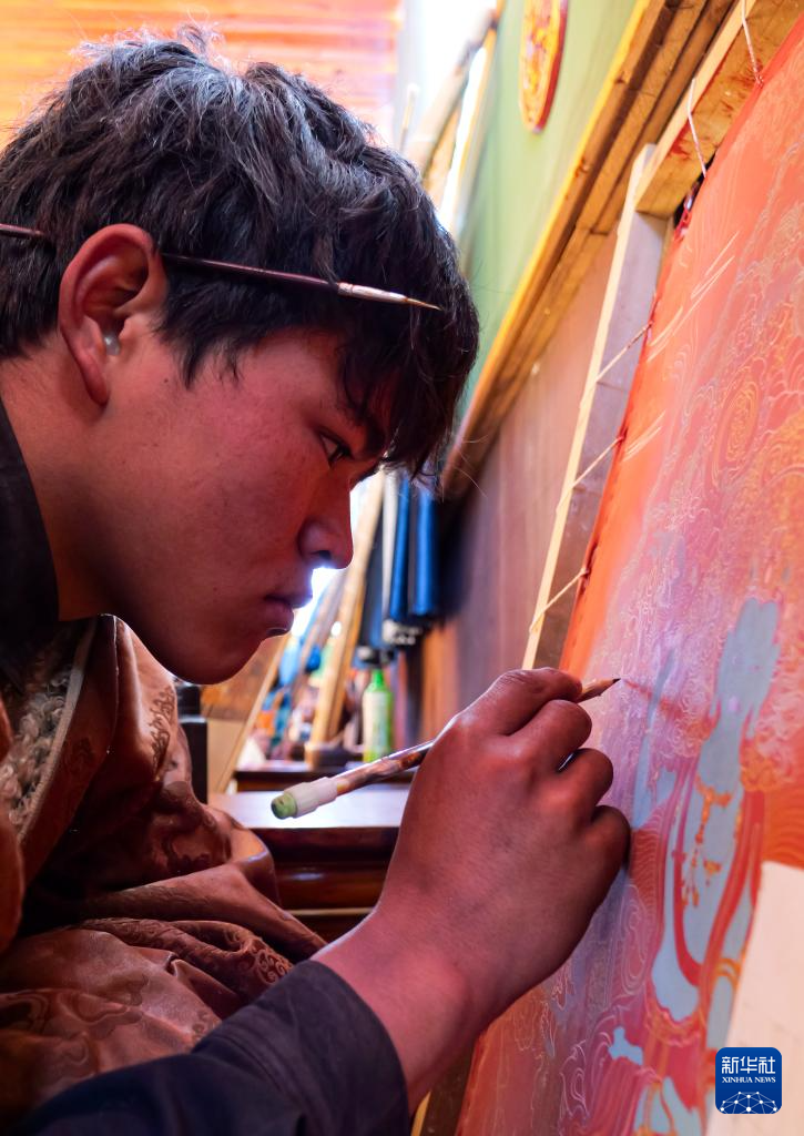 11月22日,昌都市丁青縣擁忠文化藝術(shù)中心非遺扶貧就業(yè)工坊學(xué)員在畫唐卡。新華社記者 格桑朗杰 攝
