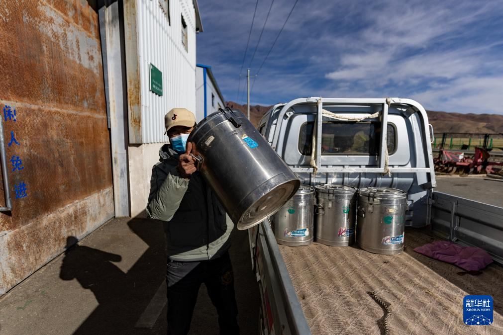 11月28日,牧民次仁頓珠在收奶站搬運奶桶。新華社記者 姜帆 攝