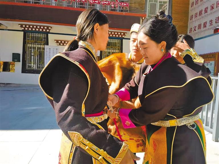 圖為穿上藏裝合影留念。記者 王珊 通訊員 王顯琴 攝