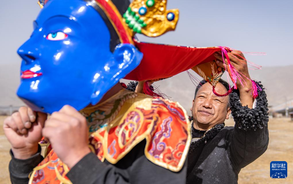 12月9日,西洛(右)在合作社門(mén)前的空地上和同事一起檢查做好的西藏傳統(tǒng)面具。新華社記者 丁增尼達(dá) 攝 ??