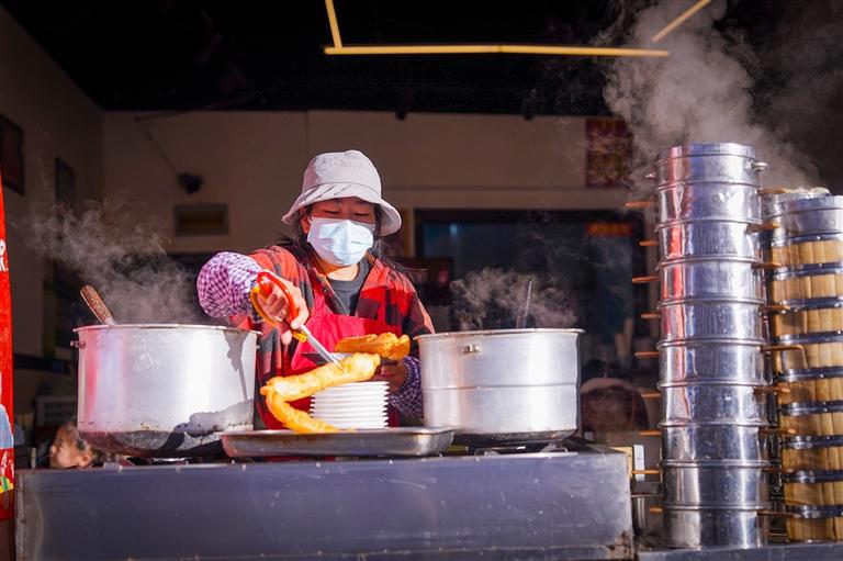 早上九點(diǎn),楊三姐的早餐店里生意正好,她一邊炸著韭菜盒子一邊忙碌地招呼著顧客。“嬢嬢,幫我把油條剪成小段?!鄙习嘧鍎⑴縼淼降昀铮I了一份豆?jié){油條。她說:“早上冷,我喜歡把油條泡進(jìn)滾燙的豆?jié){里吃,很暖和。”蒸籠揭開,一股股蒸騰的熱氣撲面而來,包子面皮軟糯,內(nèi)里餡料飽滿,趁熱咬上一口,濃郁的香味喚醒還在沉睡的味蕾。楊三姐告訴記者:“除了面點(diǎn),也有很多人愛點(diǎn)豌雜面等粉面,早上喝口熱湯才舒服?!?/p>