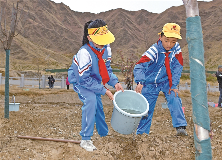 拉薩市第一小學(xué)學(xué)生在城關(guān)區(qū)慈覺林植樹點參加春日植樹活動。記者 潘多 洛桑 攝