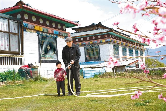 圖為巴宜區(qū)米瑞鄉(xiāng)通麥村村民扎西格勒在自家庭院給草坪灑水。見習記者 胡文 攝