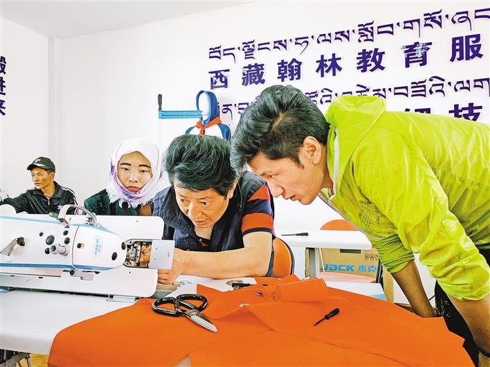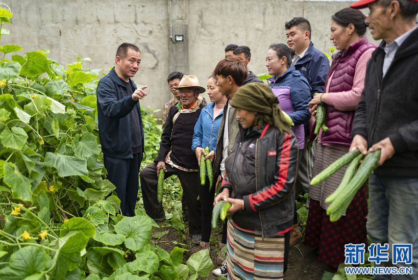 7月30日,西藏自治區(qū)供銷合作社社有企業(yè)負責(zé)人趙全(左一)給當(dāng)?shù)厝罕娭v解蔬菜種植知識。新華社記者 普布扎西 攝