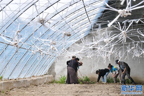 格桑旺姆(右三)與姐姐德吉卓瑪(右二)帶領(lǐng)工人在蔬菜大棚內(nèi)翻地,準(zhǔn)備種新的蔬菜(8月3日攝)。