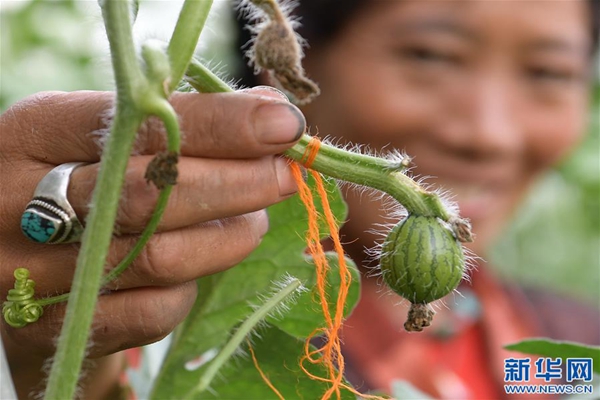 格桑旺姆姐妹家大棚內(nèi)的瓜秧上結(jié)出的小西瓜(8月2日攝)。