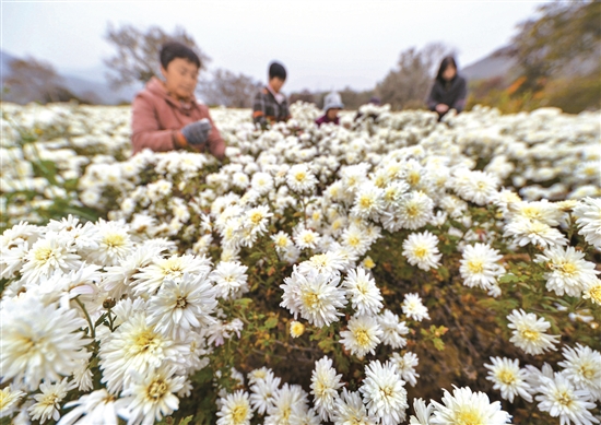 10月27日,農(nóng)戶在涉縣索堡鎮(zhèn)懸鐘村菊花種植基地采摘菊花。 (新華社發(fā))