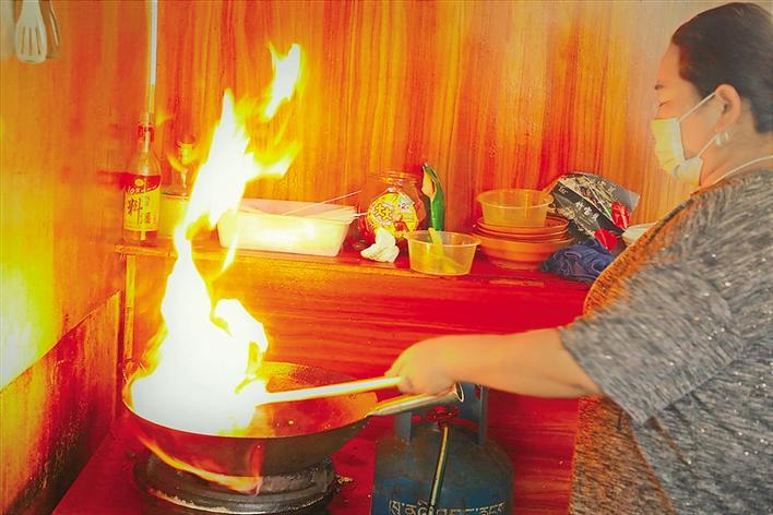 宗吉在茶館為客人炒菜。 圖/文 記者 黃志武 格桑倫珠