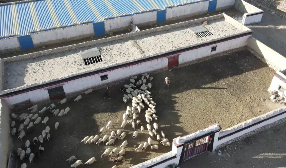 圖為航拍西藏宗措村崗巴羊養(yǎng)殖合作社。