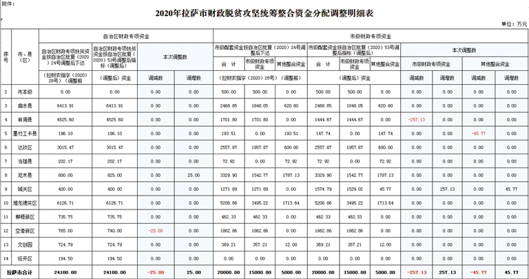 附件:2020年拉薩市財政脫貧攻堅統(tǒng)籌整合資金分配調(diào)整明細(xì)表