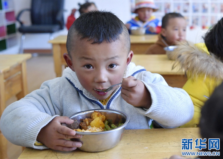 西藏山南市貢嘎縣吉雄鎮(zhèn)紅星社區(qū)雙語幼兒園的孩子吃午餐(11月25日攝)。新華社記者 張汝鋒 攝