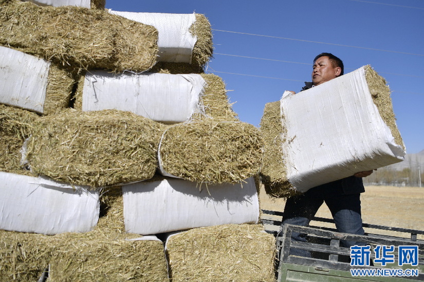 西藏山南市貢嘎縣吉雄鎮(zhèn)紅星社區(qū)致富帶頭人、奶牛養(yǎng)殖基地負(fù)責(zé)人邊巴碼放冬儲飼草(11月25日攝)。新華社記者 張汝鋒 攝