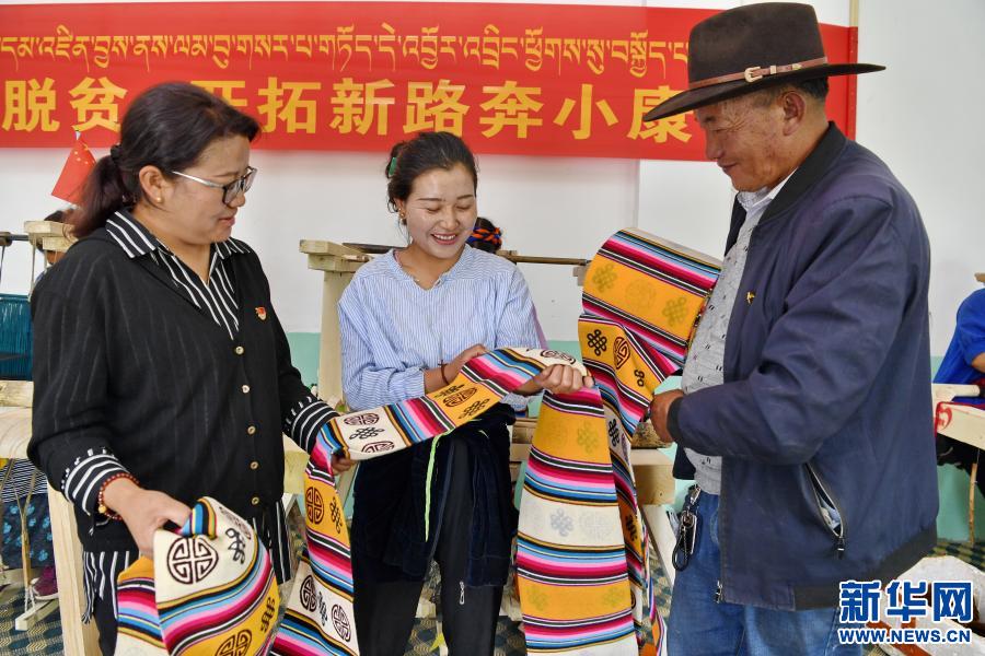2020年7月6日,西藏扎囊縣吉汝鄉(xiāng)扎西林村駐村工作隊(duì)隊(duì)長(zhǎng)央珍(左)、黨支部書記旺扎(右)和專業(yè)合作社社員次旺曲珍查看民族手工業(yè)(邦典)質(zhì)量。 新華社記者 張汝鋒 攝
