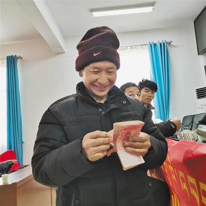 圖為卡瑪村村民斯塔次旦在合作社開心地數(shù)著自己的分紅和工資。記者 曲珍 萬靖 攝