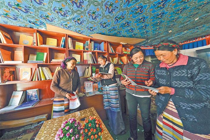 圖為央拉(右二)和合作社婦女們?cè)陂喿x室閱讀書籍。記者 格桑吉美 攝