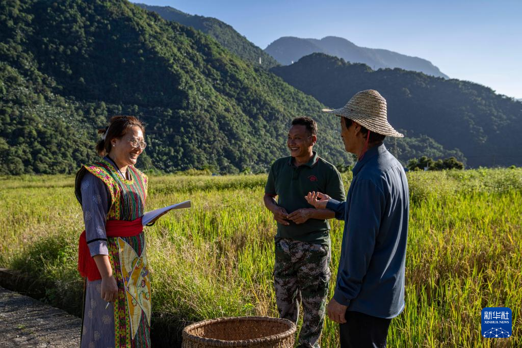 在墨脫縣德興鄉(xiāng),鄉(xiāng)黨委副書記白瑪曲珍(左)在田間調(diào)研(2023年10月13日攝)。新華社記者 孫非 攝