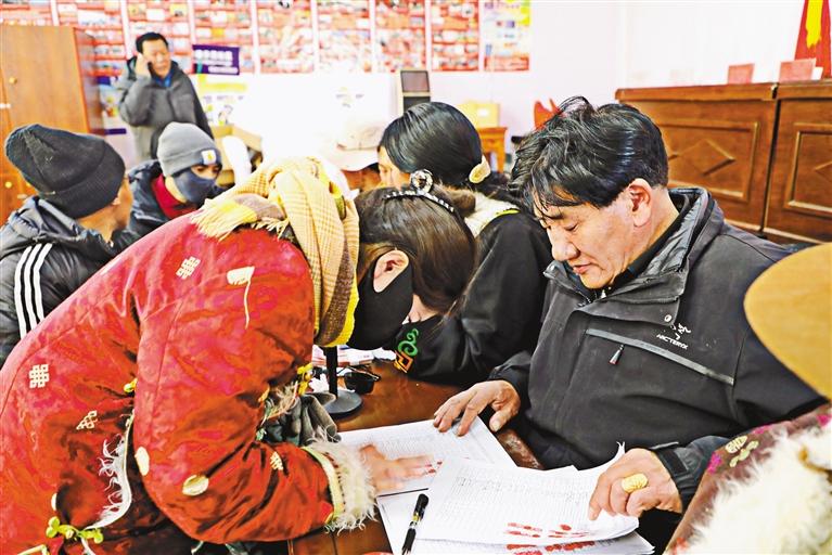 圖為圓夢新居社區(qū)群眾有序排隊、簽字、按手印,準備領(lǐng)取分紅。 記者 達珍 永青 攝
