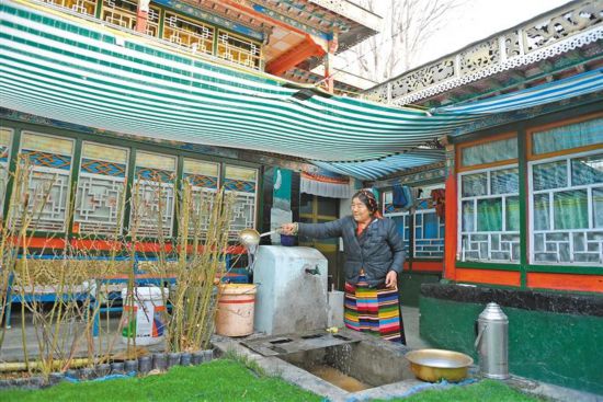 多吉曲珍在院子里接水澆花。溫暖舒適的客廳內(nèi),多吉曲珍的丈夫土旦在看電視,嶄新的電視正播放著藏語譯制劇。[詳細]