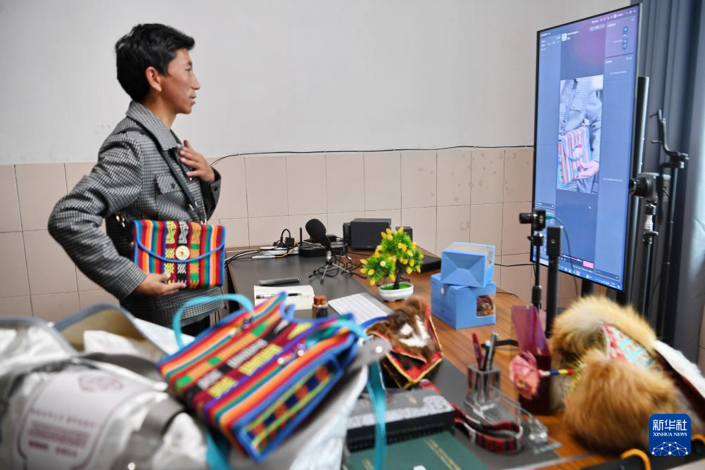 倉(cāng)秋多吉通過網(wǎng)絡(luò)銷售當(dāng)?shù)氐漠a(chǎn)品(8月24日攝)。新華社記者 張汝鋒 攝