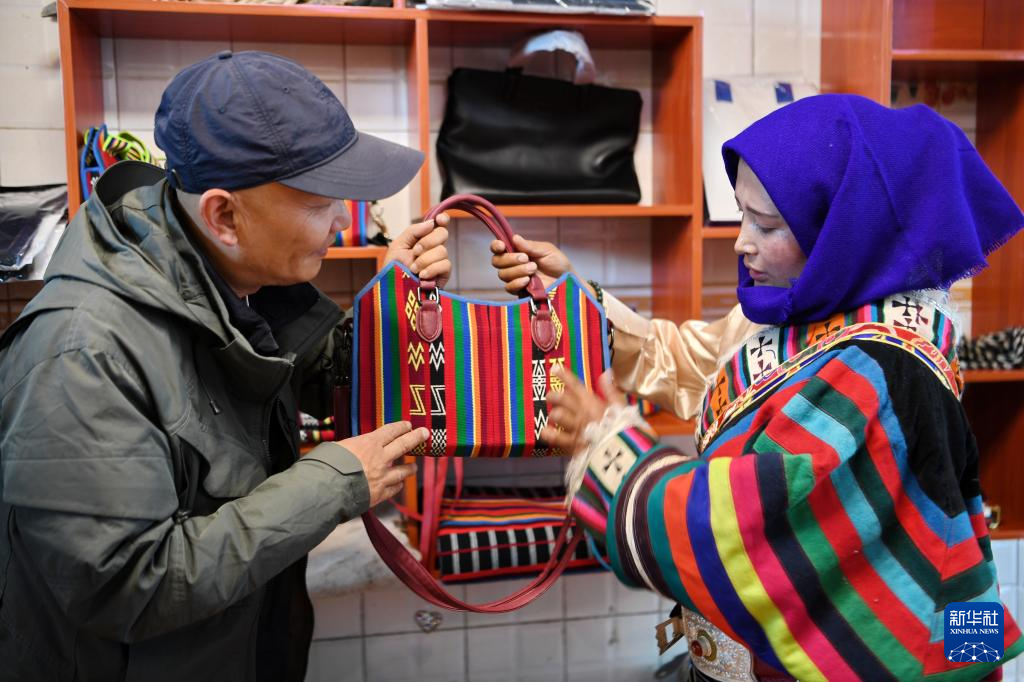 一名來自上海的游客(左)在安多托尕爾倉(cāng)游牧產(chǎn)業(yè)有限責(zé)任公司展廳挑選產(chǎn)品(8月24日攝)。新華社記者 張汝鋒 攝