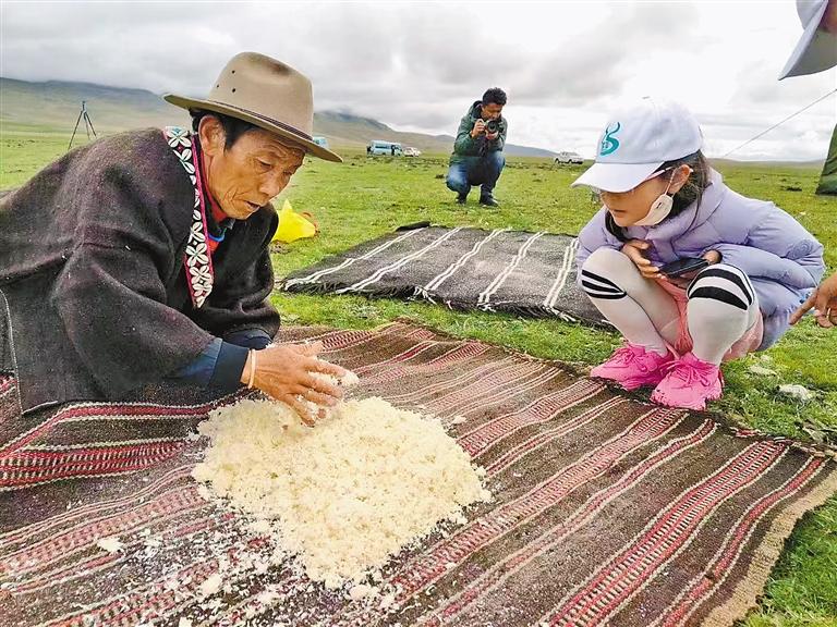 圖為游客在瑪如村觀看當(dāng)?shù)啬撩裰谱髂淘S浾?丹增平措 攝