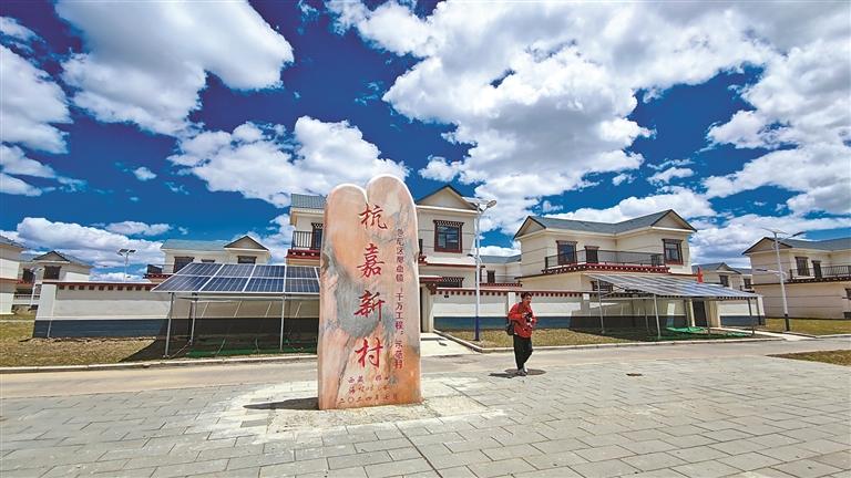 下高速后,沿著嶄新的鄉(xiāng)村鋪裝路面,幾分鐘便可到達杭嘉新村。85套裝配式結(jié)構(gòu)的民房映入眼簾,兼具藏式民居和江南水鄉(xiāng)特色的建筑造型,是浙藏兩地交往交流交融的美麗結(jié)晶。
