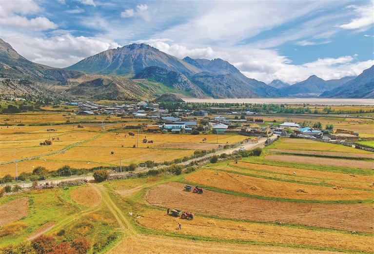 金秋時節(jié),昌都市八宿縣然烏鎮(zhèn)雅卡村的青稞田一片金黃,鋪展至巍峨的雪山腳下,構(gòu)成一幅動人的畫卷。伴隨著機器的轟鳴,青稞收割正式開始,村民駕駛著農(nóng)用車來回運輸,一派熱鬧繁忙的豐收景象。