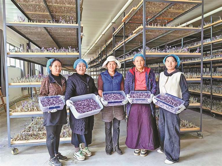 村民格桑旺姆的籃子里,是剛摘下來(lái)的藏紅花。藏紅花從開(kāi)花到凋謝只有短短幾個(gè)小時(shí),如果不及時(shí)采摘,花朵凋謝后就會(huì)失去價(jià)值?!霸谶@里上班離家近,一天有200元收入。”格桑旺姆說(shuō)。