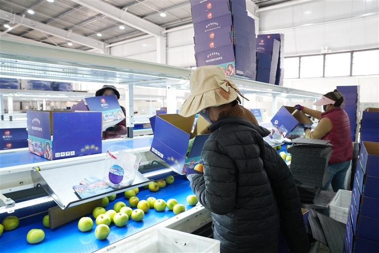 除了田間基地,蘋果產(chǎn)業(yè)鏈的延伸還為群眾帶來了更多就業(yè)選擇。位于洞嘎鎮(zhèn)巴基塘的智能化蘋果分揀車間于今年新建落成,車間內(nèi)流水線高效運轉(zhuǎn),工人們熟練地分揀、裝箱、搬運蘋果,空氣中的果香愈發(fā)濃郁。據(jù)車間負(fù)責(zé)人介紹,近期正忙著為電商平臺備貨,每天有16名工人負(fù)責(zé)打包1200余箱蘋果;因發(fā)貨繁忙,車間還額外雇傭了當(dāng)?shù)嘏R時工,讓農(nóng)閑群眾多了一份收入。
