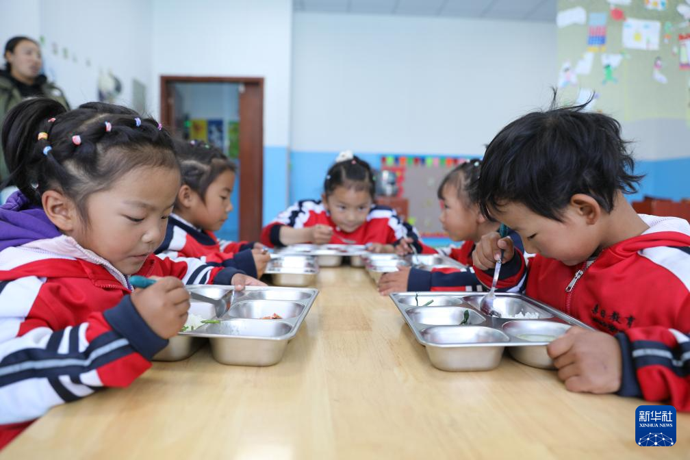 扎嘎新村幼兒園學生正在吃午飯。新華社發(fā)(嘉措 攝)