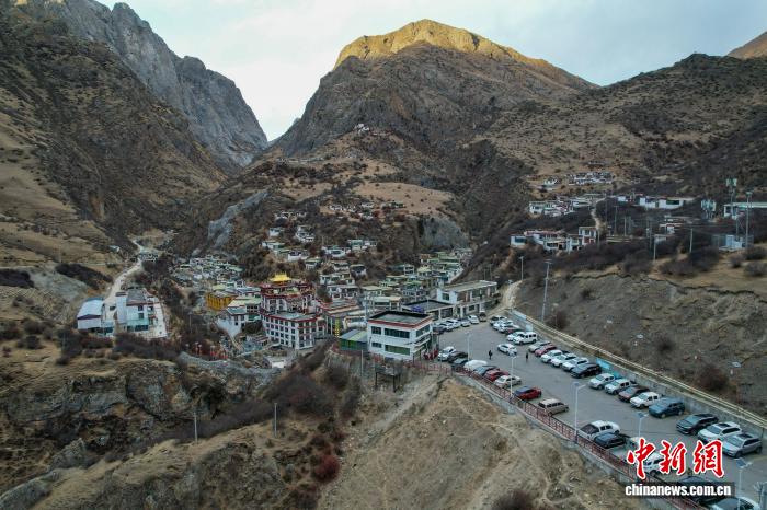 1月2日傍晚,拉薩市墨竹工卡縣德仲溫泉附近的停車場(chǎng)幾乎停滿了車輛。(無(wú)人機(jī)畫面)中新社記者 江飛波 攝