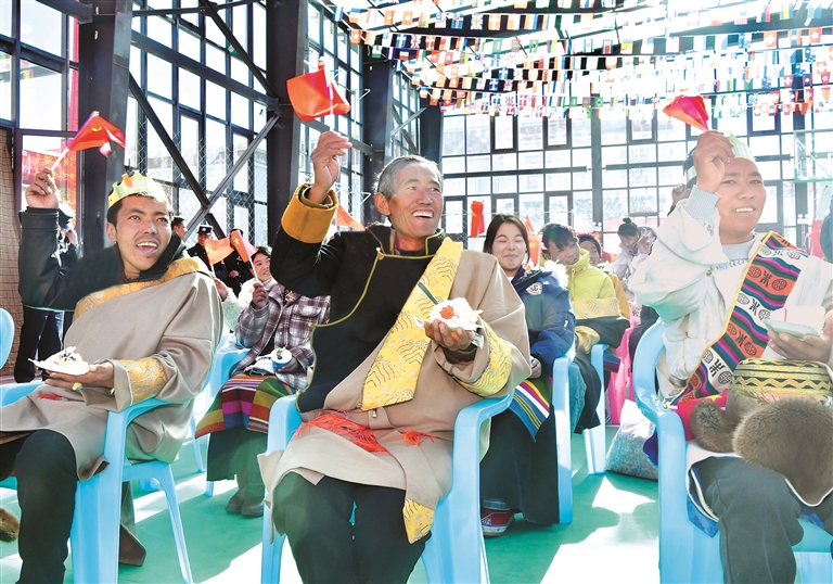 這一幕,發(fā)生在1月6日日喀則市定結縣郭加鄉(xiāng)政府禮堂里舉行的“感恩奮進新居樂業(yè),暖冬六送情滿家園”活動現(xiàn)場。