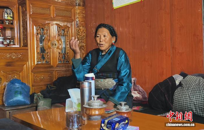 圖為定日縣長(zhǎng)所鄉(xiāng)森嘎村村民講述搬進(jìn)新家后的美好生活。貢桑拉姆 攝
