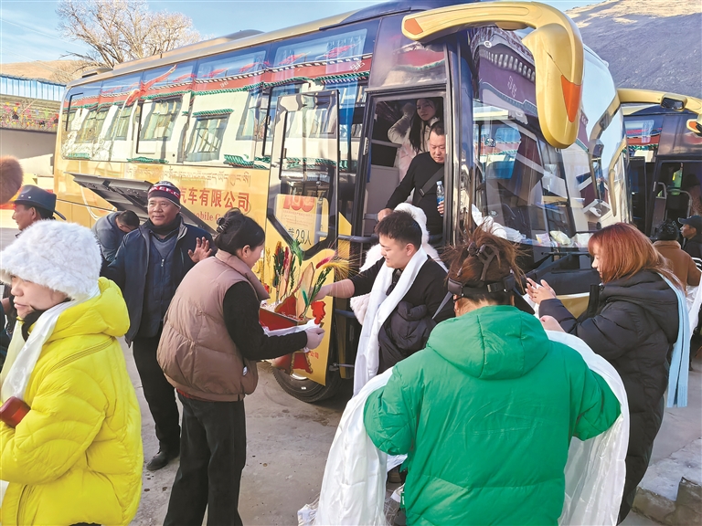 拉玉鄉(xiāng)強(qiáng)吉村來(lái)自全國(guó)各地的“冬游西藏”百人團(tuán)游客。