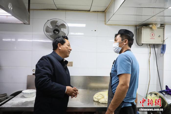 圖為馬世功(左)在西寧市一家拉面館與經(jīng)營(yíng)人員交流。馬銘言 攝