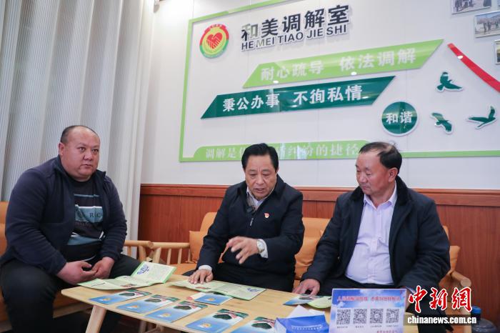 圖為馬世功(中)在“和美調(diào)解室”內(nèi)向村民普及法律知識(shí)。馬銘言 攝