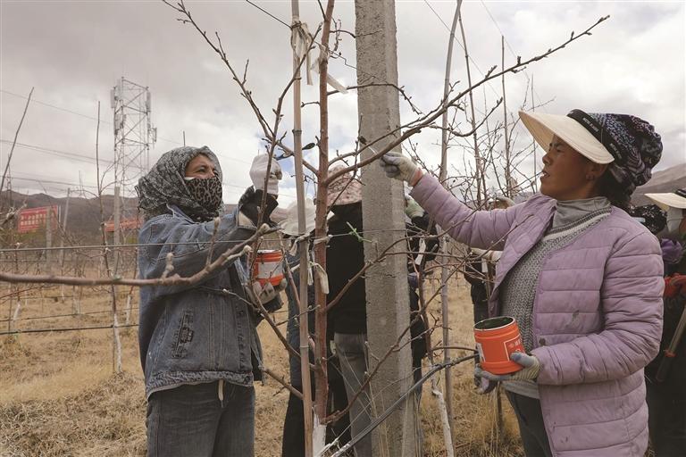 在園區(qū)內(nèi),中國(guó)農(nóng)業(yè)科學(xué)院果樹(shù)研究所專(zhuān)家手把手指導(dǎo)農(nóng)戶(hù)科學(xué)管理。修剪現(xiàn)場(chǎng),專(zhuān)家們精準(zhǔn)疏除病蟲(chóng)枝、弱枝、交叉枝,優(yōu)化果樹(shù)樹(shù)形結(jié)構(gòu),保障通風(fēng)透光;施肥區(qū)域,農(nóng)戶(hù)們嚴(yán)格按照科學(xué)配比有序施肥,精準(zhǔn)補(bǔ)充果樹(shù)生長(zhǎng)所需養(yǎng)分;針對(duì)修剪后的樹(shù)枝傷口,工作人員及時(shí)涂抹愈合劑,做好防護(hù)處理,有效防止病菌侵染、減少養(yǎng)分流失。“以前這里都是沙子,風(fēng)很大,現(xiàn)在變化特別大,這邊建成了果園,我們當(dāng)?shù)乩习傩者€能在這里務(wù)工,每年能拿5萬(wàn)到6萬(wàn)元工資。果園內(nèi)專(zhuān)家們定期給我們培訓(xùn),我在這邊也學(xué)到了很多蘋(píng)果種植技術(shù),我很喜歡這份工作?!痹铱h扎其鄉(xiāng)朗賽嶺村2組村民洛桑央吉感慨道。