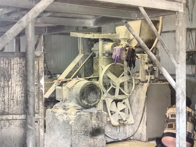 4月10日11時(shí)許,記者跟隨城關(guān)區(qū)市場(chǎng)監(jiān)管局執(zhí)法人員穿過(guò)米瓊?cè)账淼?,?lái)到一處由幾間簡(jiǎn)易鐵皮房圍建而成的院落。該院落臨近米瓊?cè)丈铰?,從外面看,任誰(shuí)也想不到這里是一家制粉廠。院落左側(cè)有一間不足60平方米的加工室,室內(nèi)一個(gè)寫(xiě)有“粉料攪拌機(jī)”字樣的儀器上,布滿了白色污垢。