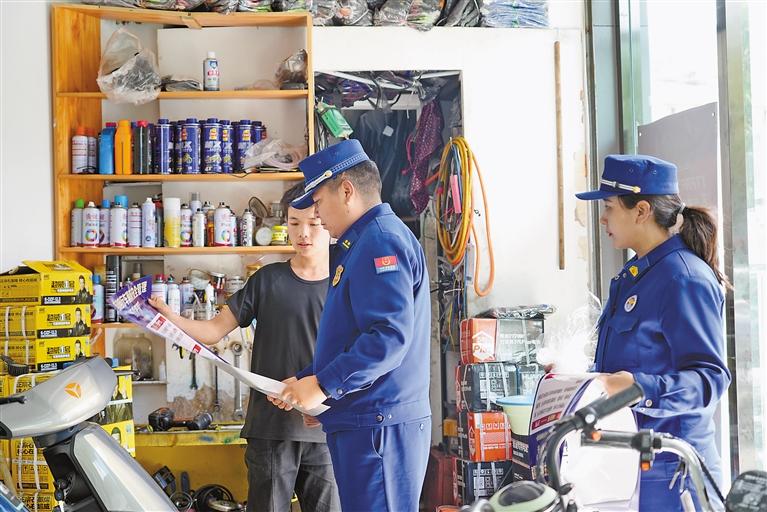 圖為瓊結(jié)縣消防救援大隊宣傳員向社區(qū)居民科普電動自行車規(guī)范停放、安全充電等常識。肖暄 攝