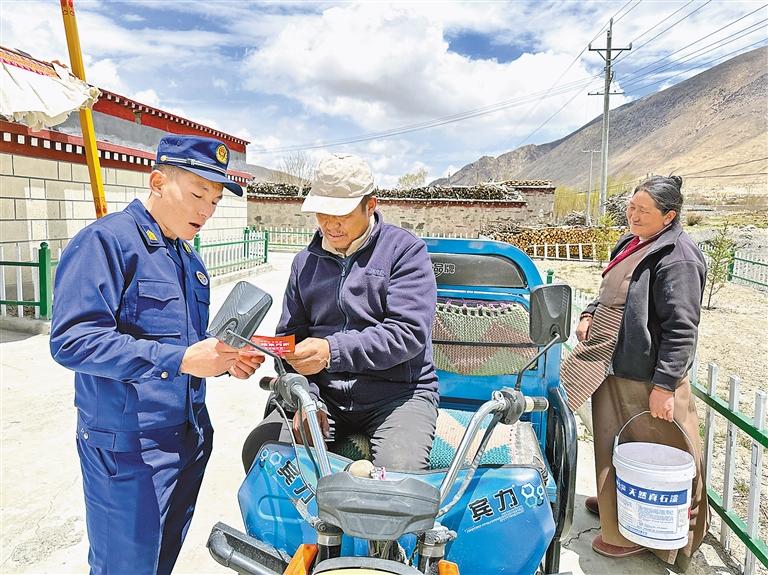 圖為洛扎縣消防救援大隊宣傳員在農(nóng)牧區(qū)開展電動自行車消防安全宣傳。