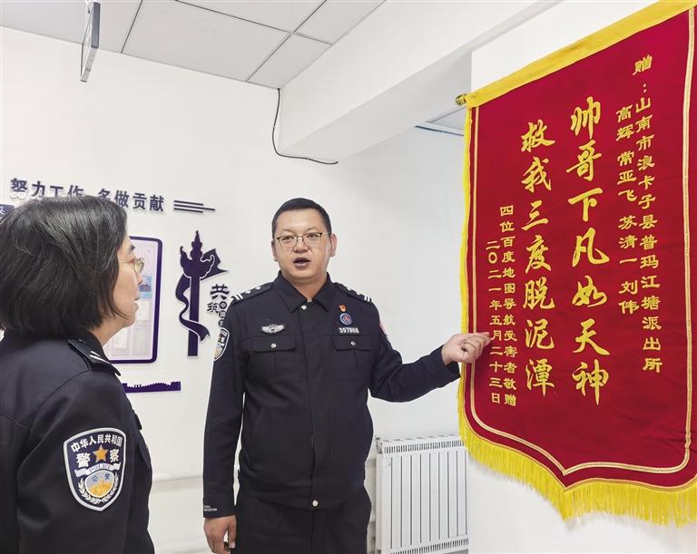 “帥哥下凡如天神,救我三度脫泥潭!”如果錦旗有生命,憑借這兩行字,它無疑會成為最引人注目的那一個。這面特別的錦旗存放在山南市邊境管理支隊普瑪江塘邊境派出所的榮譽室里。2021年5月,普瑪江塘邊境派出所接到求助電話,稱4名游客駕車前往崗布冰川被困沼澤,亟待救援。接警后,民警迅速到達現(xiàn)場進行救援。游客脫險后千恩萬謝,與民警互留電話。民警叮囑他們趕緊離開,不要再去冰川了。然而走了還不到5分鐘,民警又接到電話,稱他們再次駕車陷入泥沼動彈不得。警車原路返回,進行救援。然而民警剛離開10分鐘,再次接到了游客電話:“警官,非常不好意思,我們又陷進去了還得麻煩你們再回來一趟?!庇谑?,這面“救我三度脫泥潭”的錦旗便誕生了。