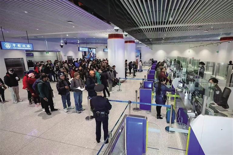 在邊境通行證辦理和邊境檢查站點(diǎn)優(yōu)化方面,西藏邊檢總站聚焦邊境通行證申領(lǐng)辦理過程中的難點(diǎn)、痛點(diǎn)、熱點(diǎn)問題,逐個(gè)進(jìn)行攻堅(jiān)突破。2024年,新增18個(gè)非邊境縣辦理邊境通行證的權(quán)限,至此,辦證室(點(diǎn))已覆蓋全區(qū)74個(gè)縣(區(qū)、市)以及重要交通樞紐,極大地方便了群眾就近辦理邊境通行證。同時(shí),結(jié)合邊境路網(wǎng)建設(shè)規(guī)劃和邊境檢查站點(diǎn)設(shè)置情況,不斷調(diào)整優(yōu)化邊境檢查站點(diǎn)布局,為邊境地區(qū)經(jīng)濟(jì)社會發(fā)展疏通脈絡(luò)。全年共檢查進(jìn)出邊境管理區(qū)人員1155萬余人次。