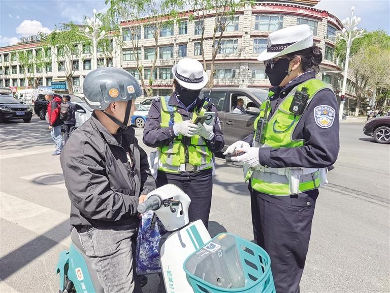 “騎乘電動車請戴好頭盔?!薄靶腥诉^馬路不要闖紅燈。”4月27日下午,記者來到拉薩市江蘇路、金珠東路、康昂多南路三岔口,看到拉薩市公安局交警支隊城北大隊的民警正在路口疏導(dǎo)交通,并針對電動車駕駛員未佩戴安全頭盔等情況,進(jìn)行現(xiàn)場查糾。